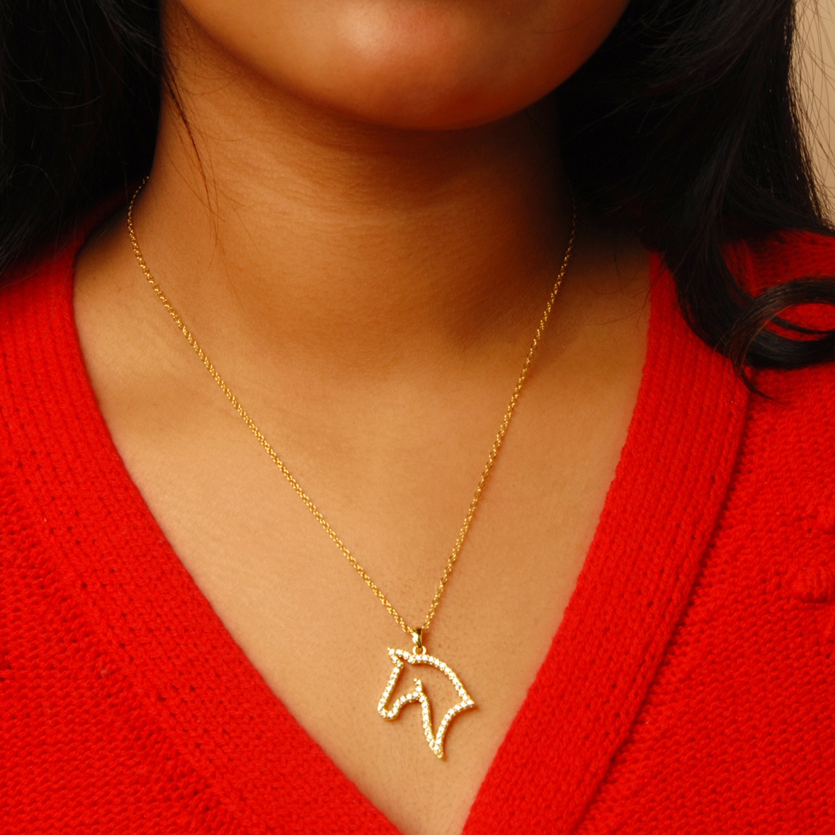 Equine inspired our stunning "Horse Love" neckpiece flaunts an elegant horse head silhouette sparkling with AAA cubic zirconia suspended from a sleek 18" designer chain. Nickel and lead free jewellery.