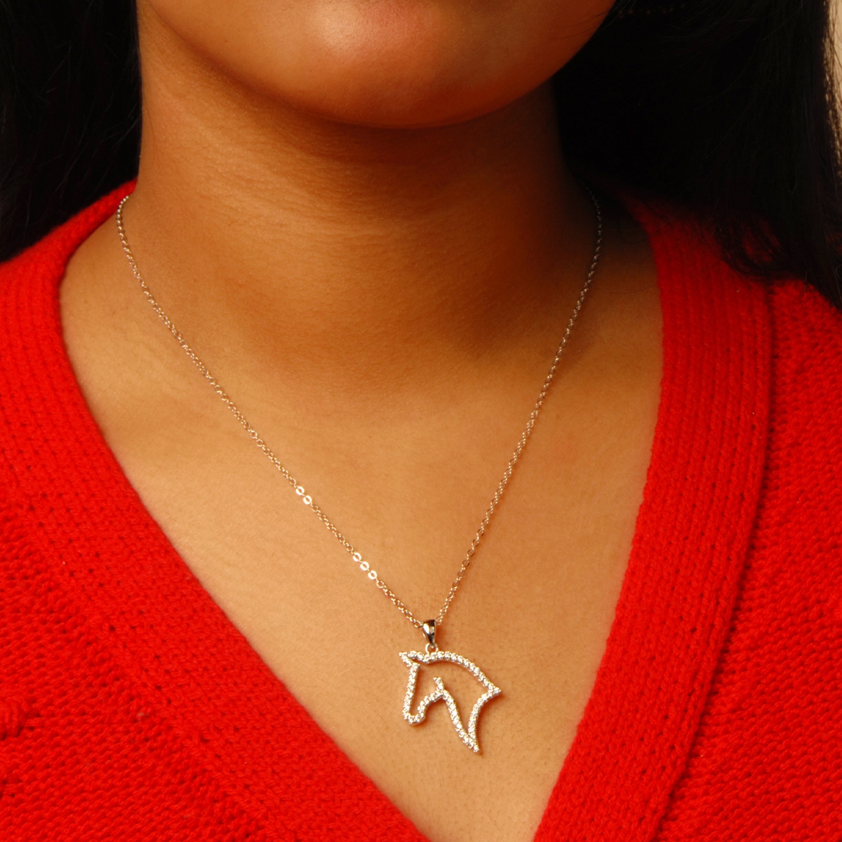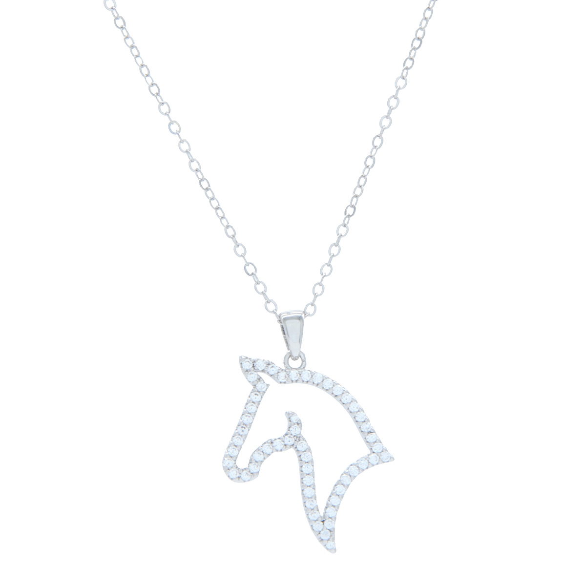 Equine inspired our stunning "Horse Love" neckpiece flaunts an elegant horse head silhouette sparkling with AAA cubic zirconia suspended from a sleek 18" designer chain. Nickel and lead free jewellery.
