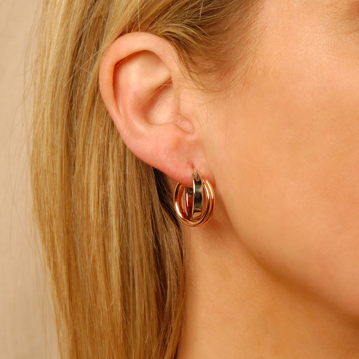 When you feel especially light-hearted and ready for adventure, you'll need “Simple Logic”. One smooth circle finished in radiant rhodium entwined with a hoop finished in gleaming rose gold, hosts titanium gold posts, featuring a lock-on clasp for extra security. These smartly styled earrings are a must for summer vacations and fun filled weekends.