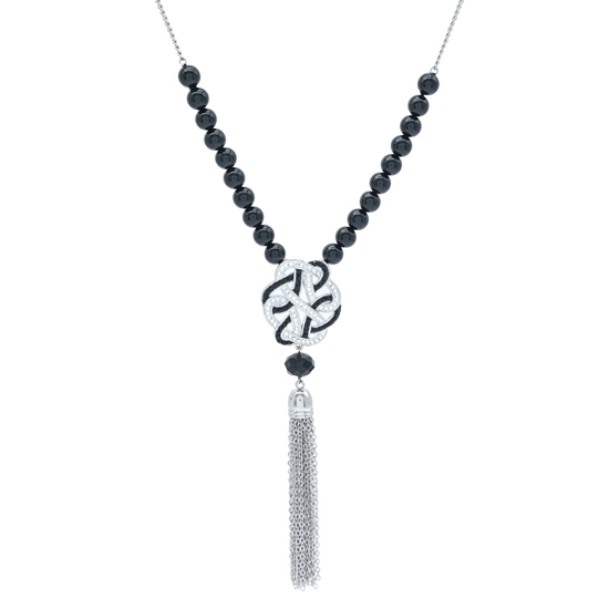 Beautiful weaved detailing in an elegant black and white combination creates timeless glam perfect for day or night. Featuring bold black onyx beads and a chic chain tassel, "Celtic Splendor" makes a grand statement. 30" neckpiece with 2" extension. Nickel and lead free jewellery.
