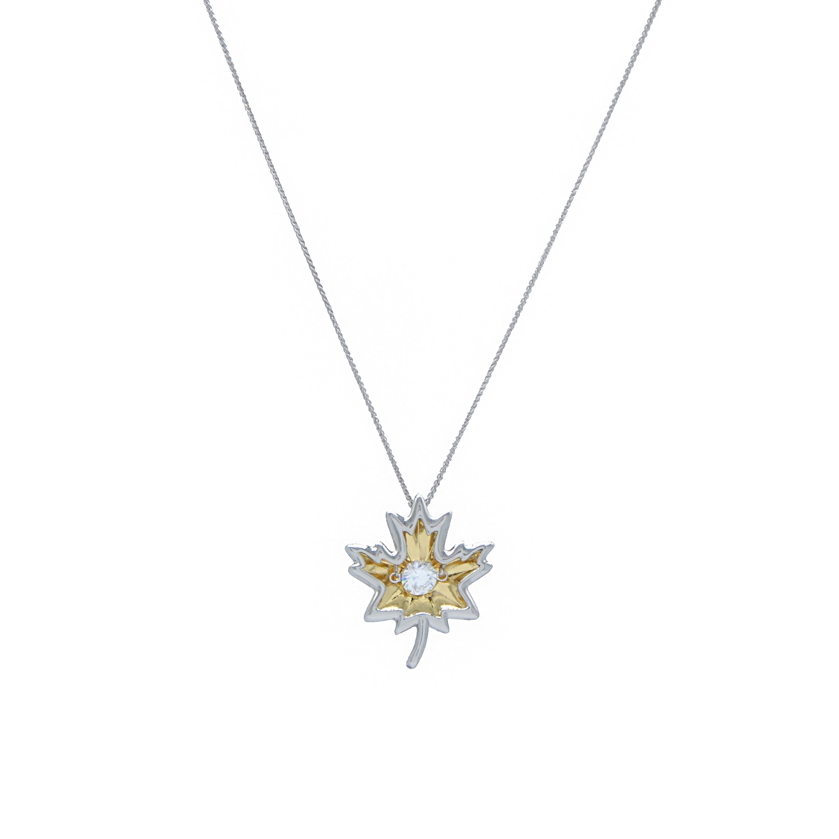 Delicately designed, this lovely FAC design shows your "Elegance & Pride" with a stunning two-tone maple leaf pendant adorned with a brilliant AAA cubic zirconia center suspended from a sleek 16" designer chain. Nickel and lead free jewellery.