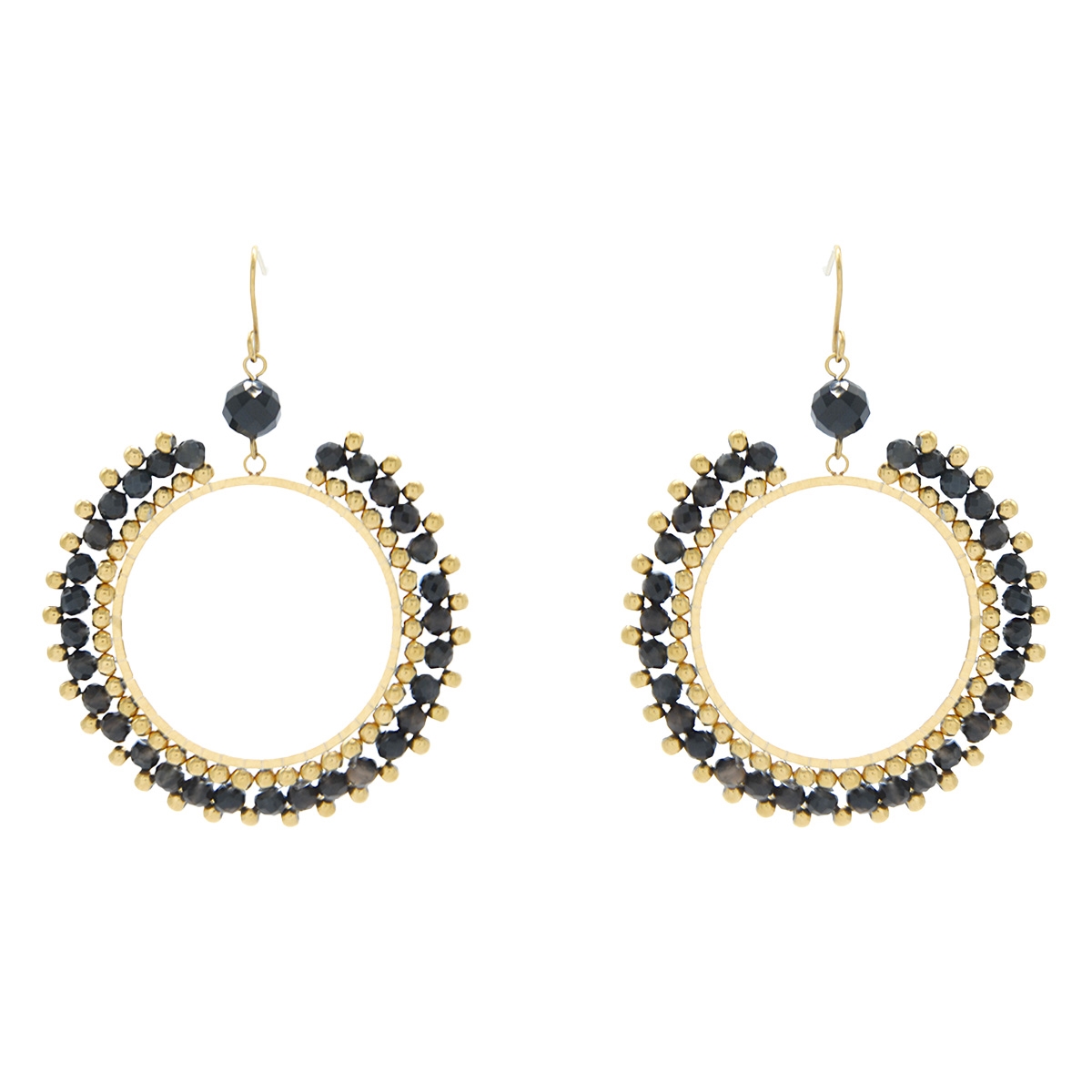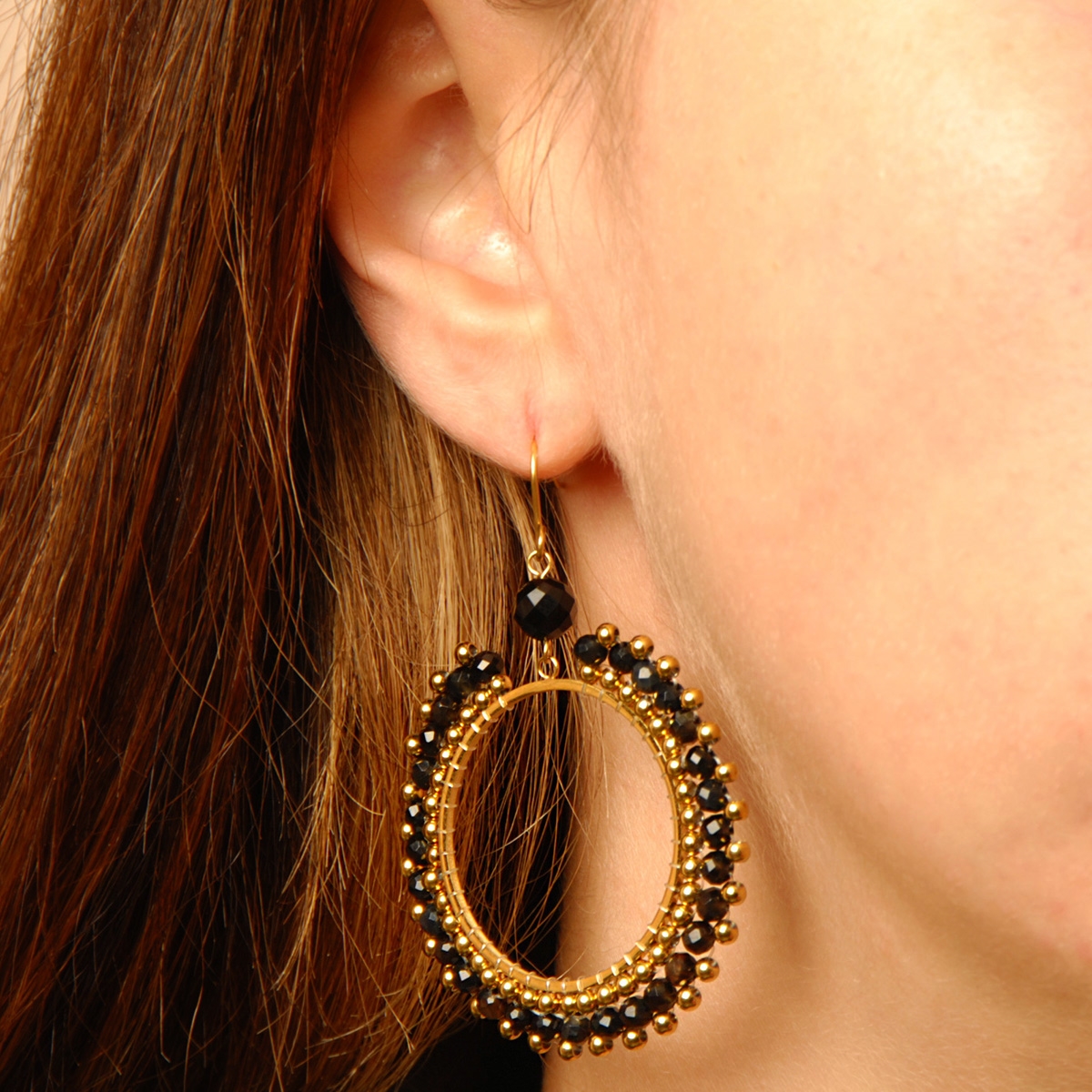Make an audacious fashion statement with our gorgeously unique "Exotic Detailing" earrings. Featuring a unique and bold geometric design showcasing alluring genuine gemstone beads in a stunning circle finished in gleaming gold suspended from sleek sterling silver hooks. Nickel and lead free jewellery.